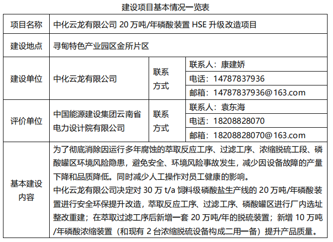我单位拟在 云南寻甸产业园区金所片区 建设 中化云龙有限公司20万吨/年磷酸装置HSE升级改造项目 ,现阶段本项目各项工程准备工作已经准备就绪,等待环评手续完善后将计划开工建设。现已委托 中国能源建设集团云南省电力设计院有限公司 编制了《中化云龙有限公司20万吨/年磷酸装置HSE升级改造项目环境影响报告书》。 根据国家环保部办公厅关于印发《建设项目环境影响评价政府信息公开指南(试行)》的通知(环办〔2013〕103号)的相关要求,现对《中化云龙有限公司20万吨/年磷酸装置HSE升级改造项目环境影响报告书》及《公众参与说明》进行报批前全本公开。公开时间: 2025 年 12 月 15 日- 2025 年 12 月 29 日。我单位承诺,公示项目信息均真实有效。如有意见,请按以下联系方式反馈,我单位将积极配合处理。 公司名称: 中化云龙有限公司 2025 年 12 月 15 日